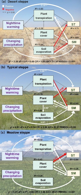 图2. 夜间增温及降水变化对三种草原微气候的影响路径。ST:土壤温度;SM:土壤湿度。