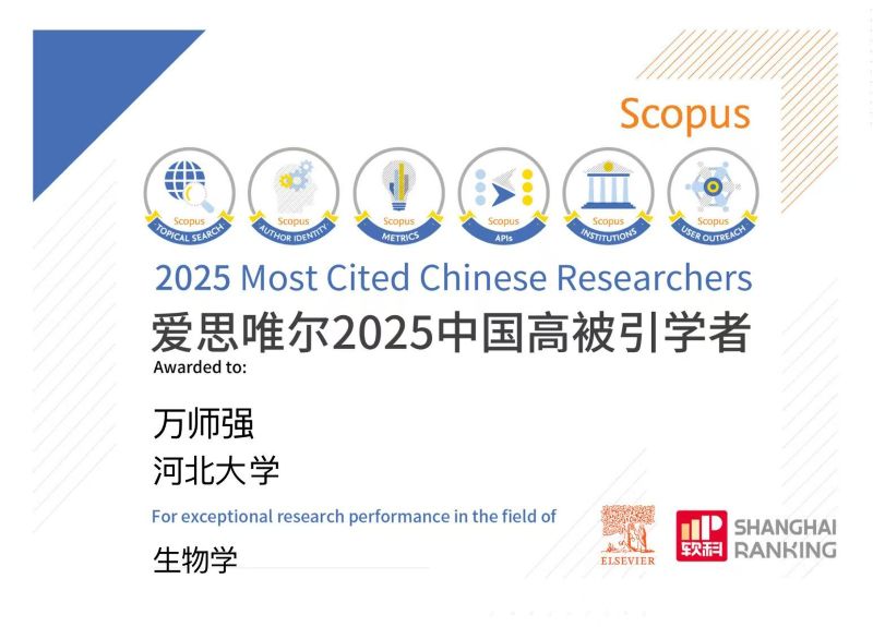 近日,万师强教授成功入选2025年爱思唯尔中国高被引学者榜单。令人瞩目的是,这已经是万师强教授自2014年以来连续第十二次入选该榜单,这一非凡成就不仅凸显了万师强教授在生态学领域的卓越贡献和持续影响力,更展现了河北大学在科学研究领域的强大实力和持续进步。